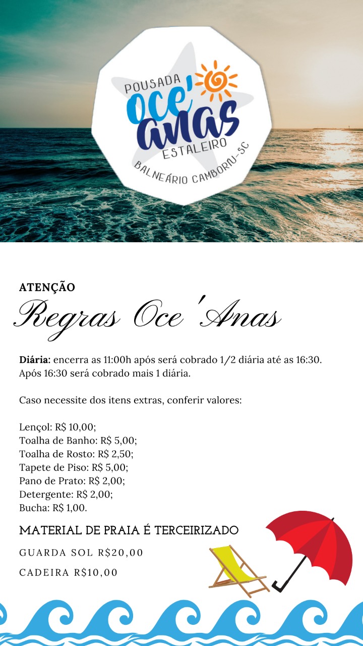 - Proibido a entrada de pessoas que não estejam hospedadas na pousada. O apartamento que receber visita estará sujeito a pagar taxa de hóspede extra de R$100,00.